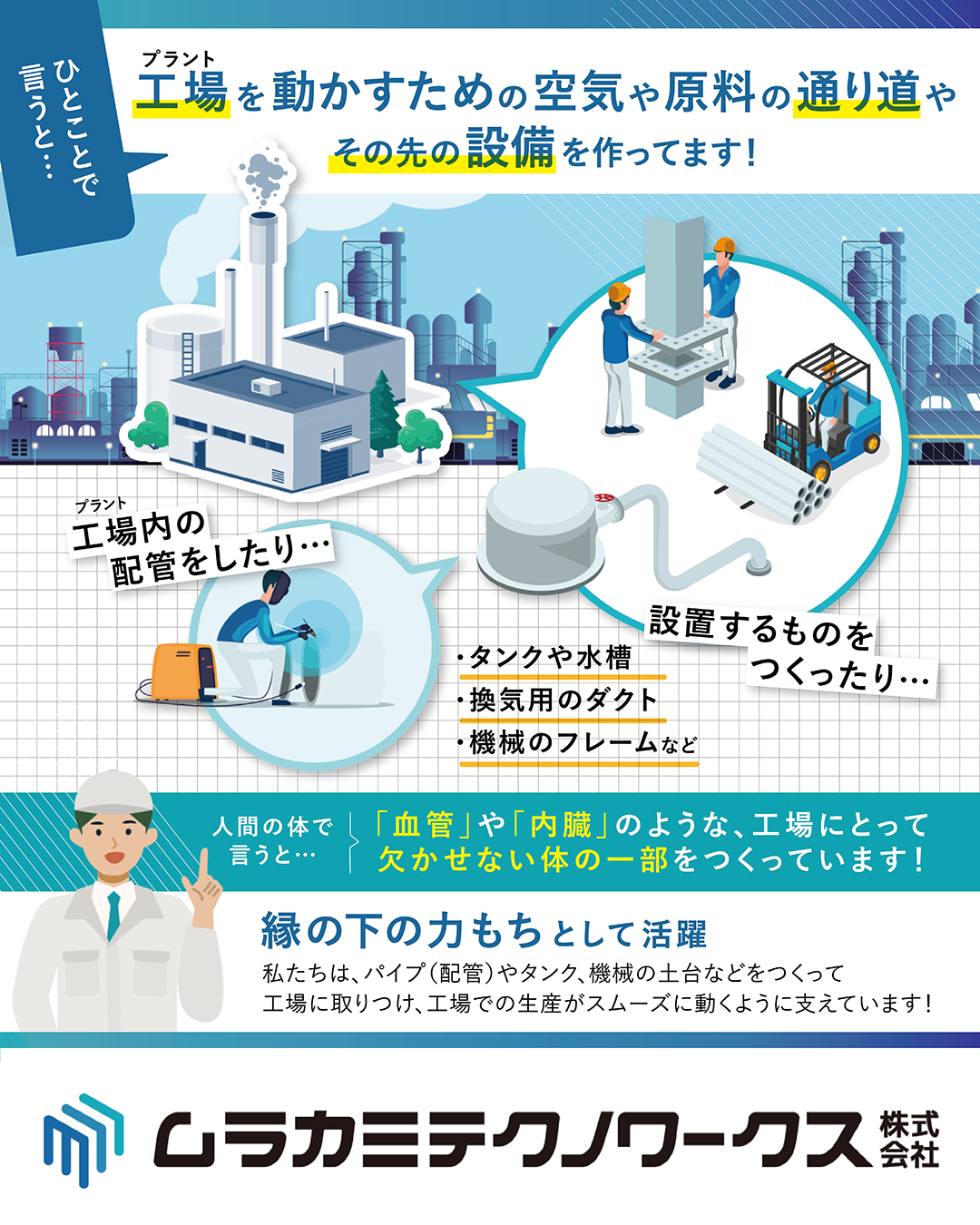 私たちムラカミテクノワークスは、配管工事を中心にプラント設備の製造・取り付けを行う会社です。