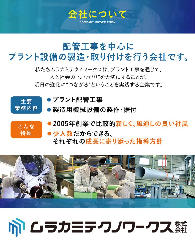 私たちムラカミテクノワークスは、配管工事を中心にプラント設備の製造・取り付けを行う会社です。