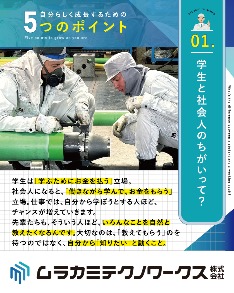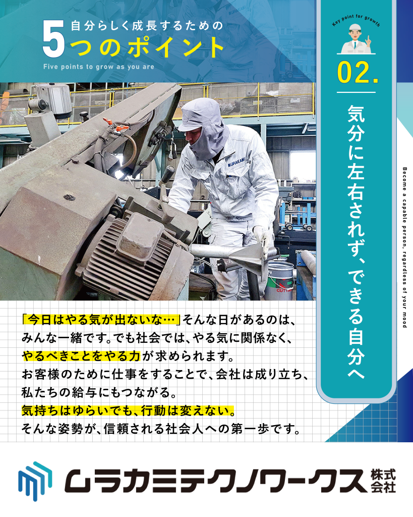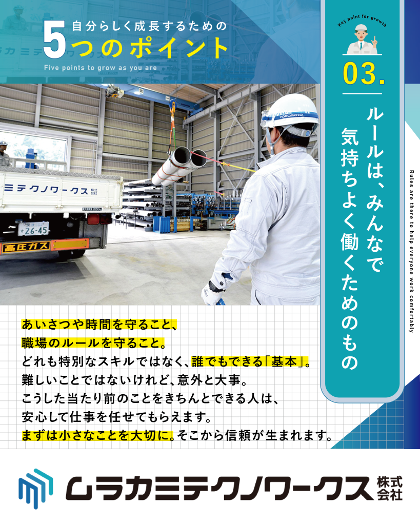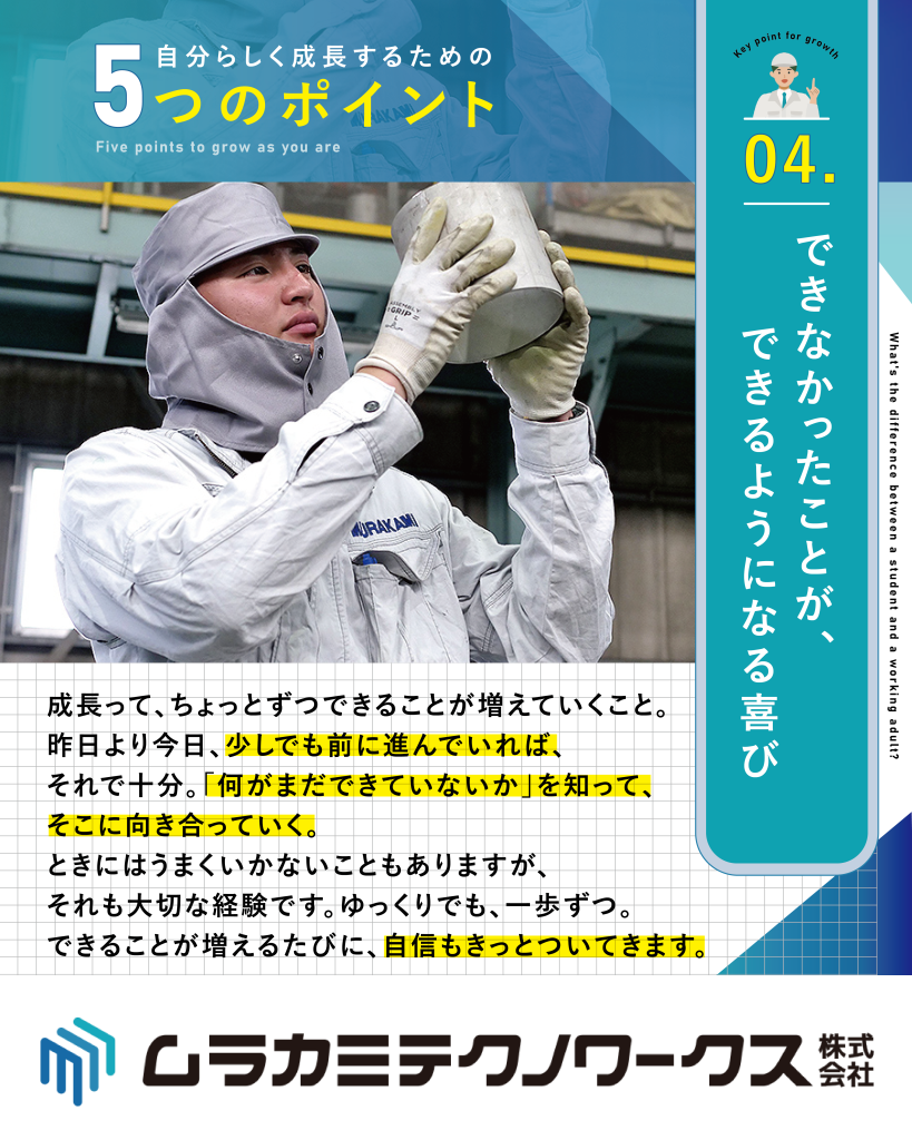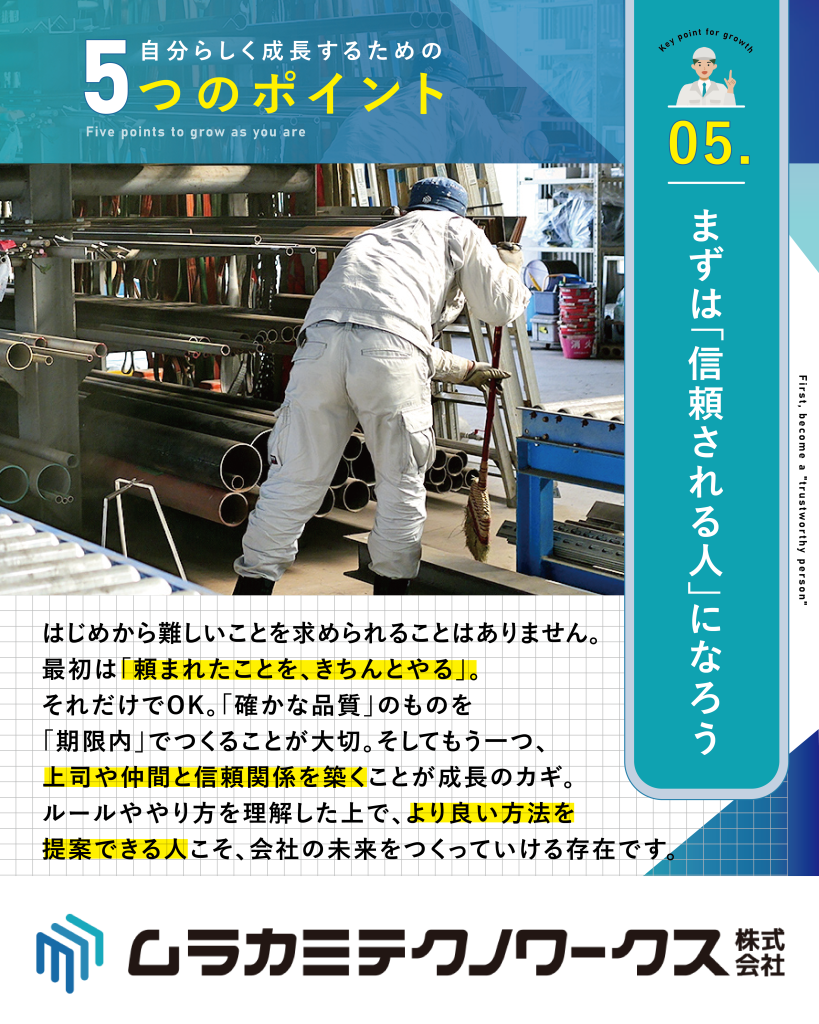 ムラカミテクノワークスでは、新入社員が安心して成長できるように5つのポイントを大切にしています。